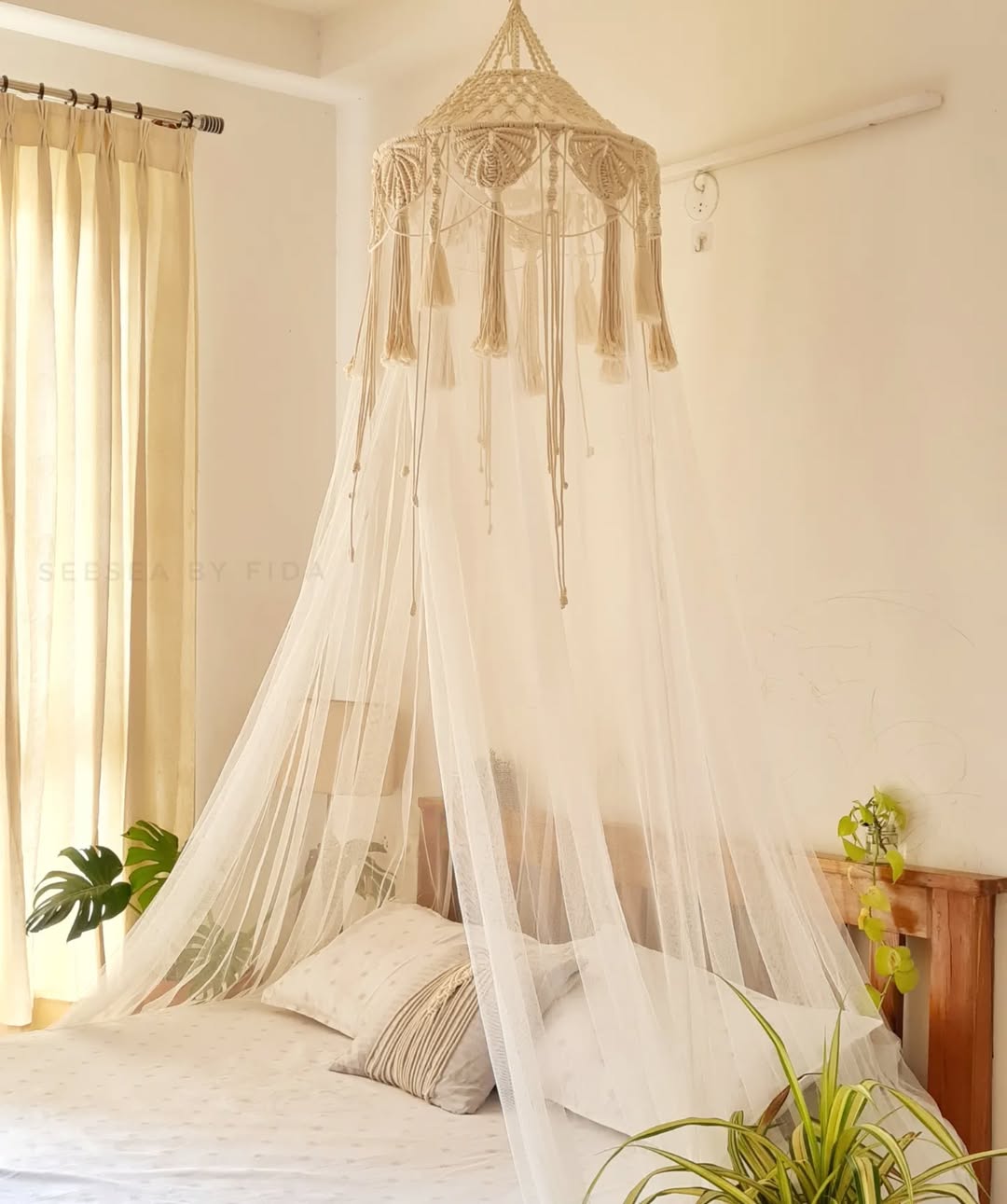 Imagine soft string lights twinkling above you at night, giving the room a dreamy glow. Or tassels swaying lightly at each corner, lending a bohemian touch.