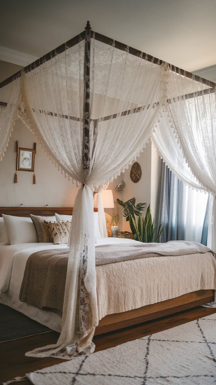 Think of how dramatic a tall, four-poster canopy looks in a room with simple walls — it becomes the centerpiece, adding vertical rhythm and presence. In low-ceiling rooms, a minimalist canopy with lighter fabric adds softness without clutter.