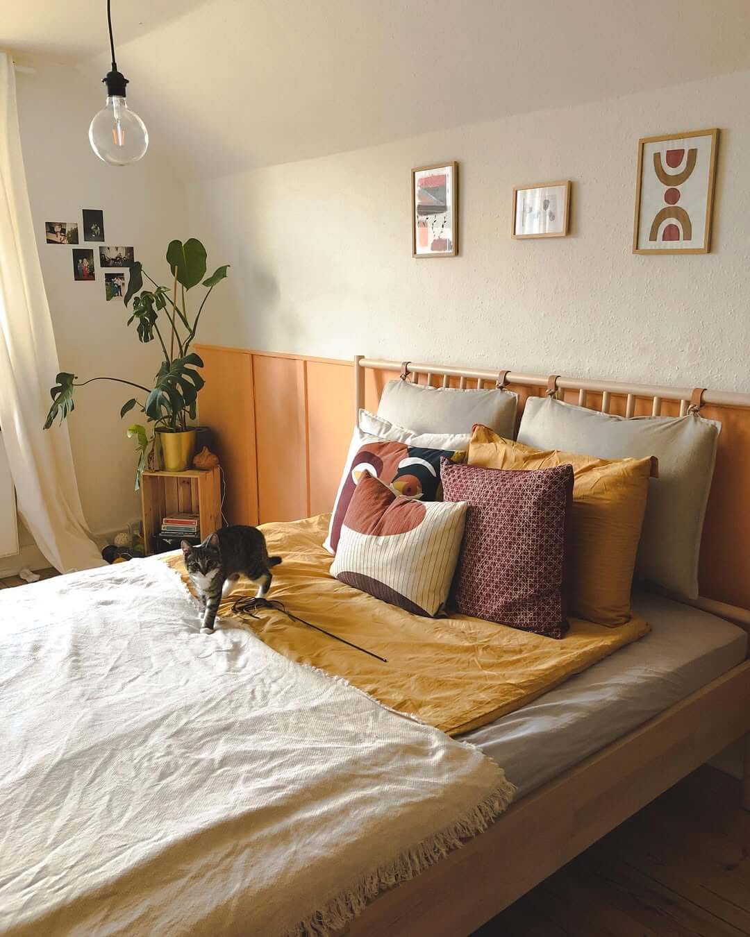 Such as mustard or terracotta pillow over a beige bedsheet.