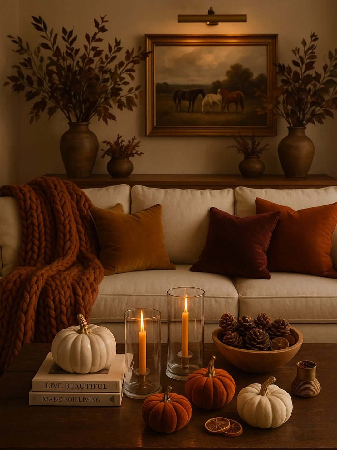 Amber bulbs cast softer shadows, while layered lighting like lamps, sconces, and even candles creates the cocoon-like feel that makes autumn nights so comforting.