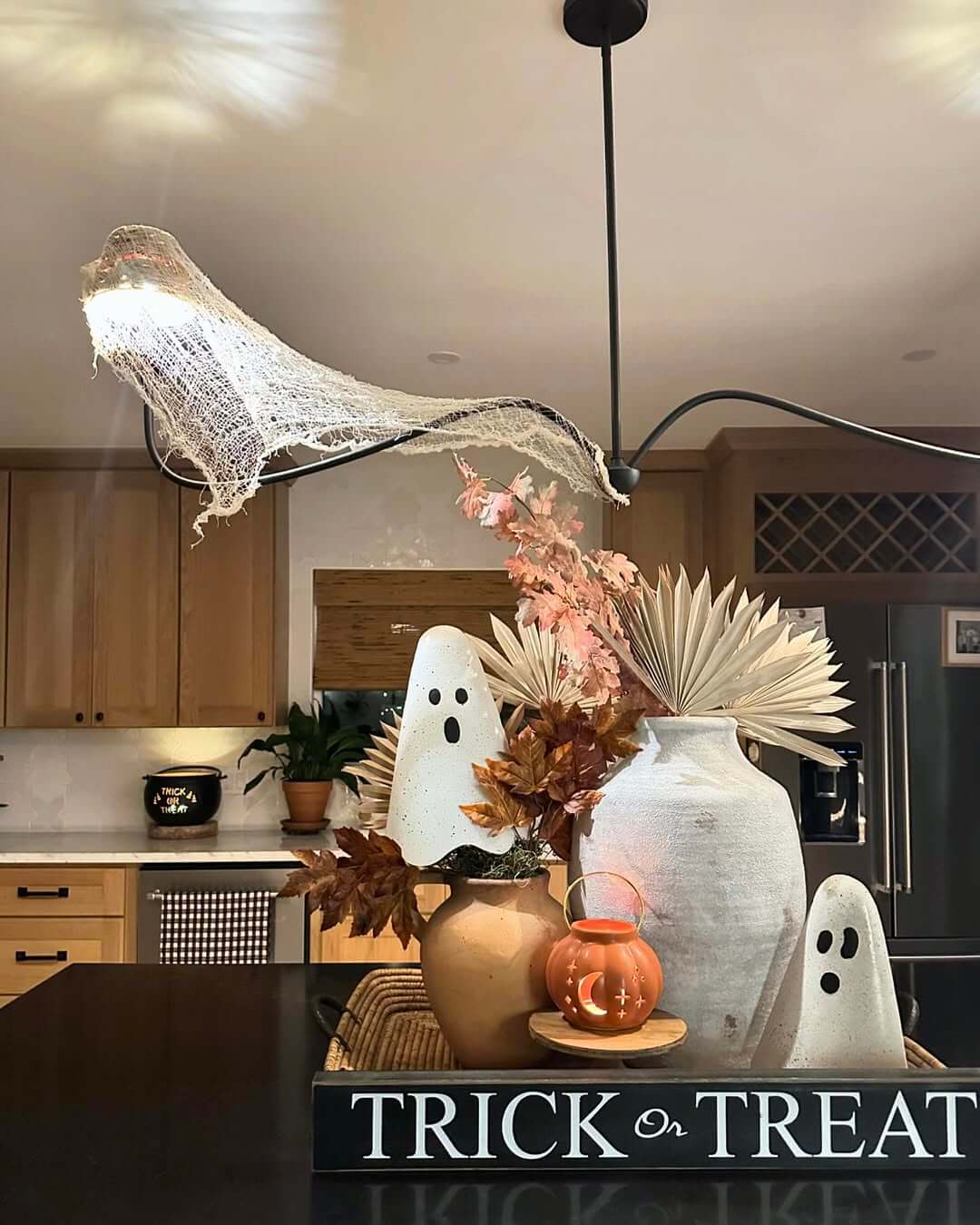 Pro tip: Don’t forget under-cabinet string lights. Wrap orange or purple strands along the backsplash, and suddenly your whole kitchen feels like a haunted hideout.