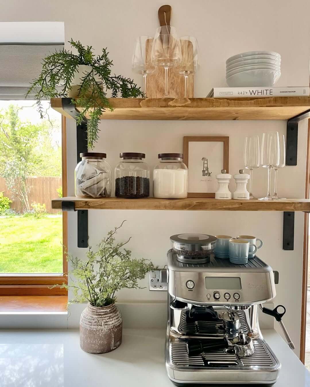 As Houzz suggests, “consider kitchen tasks, like baking or making coffee, when filling your open shelves and group items accordingly.”
