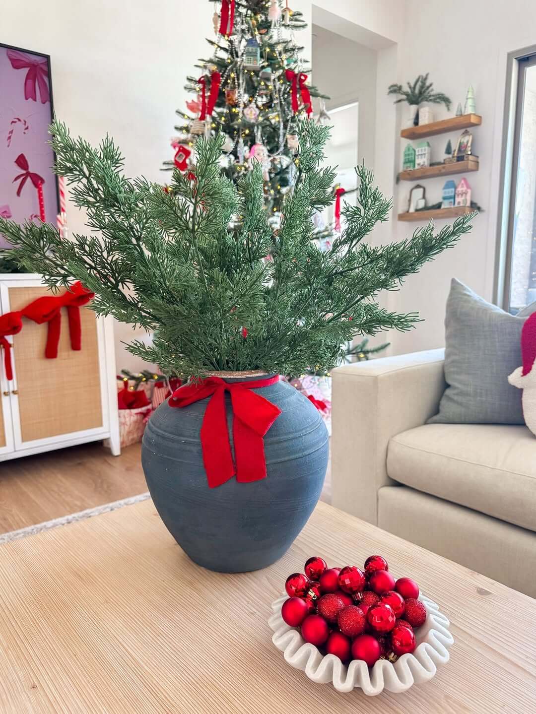 When everything in the room finally works together, you will feel it before you see it. You might sit down with a warm drink and notice the soft glow bouncing off an ornament.