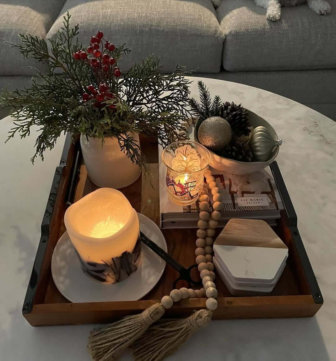 You don’t need a new collection of holiday decor. Small changes go a long way. Swap a few pillow covers for something textured. Add a knitted throw. Mix a metallic tray with soft greenery.
