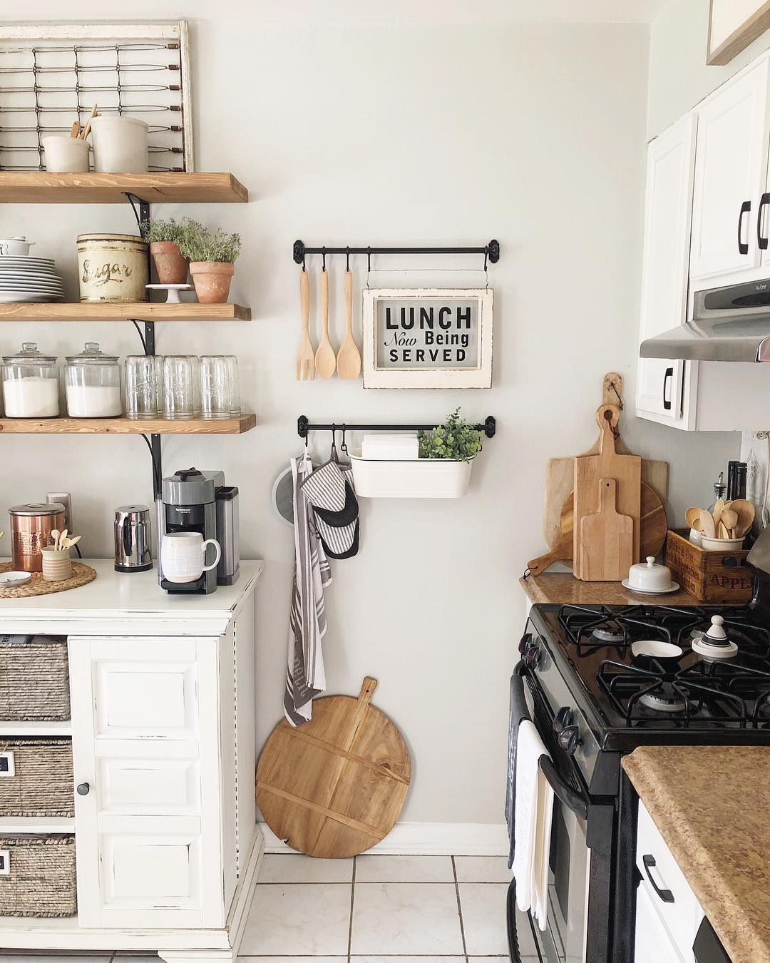 Use what you already own. Even simple things such as cutting boards, jars or cookware can serve as a decor when they are well put up. It is handy, cheap and will bring an immediate farmhouse feel.