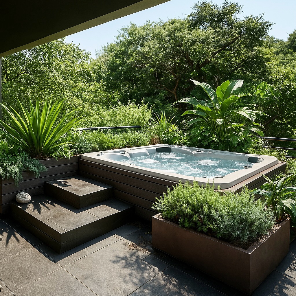 A raised platform or partial deck around the spa can make it feel custom-built, while clever landscaping hides bulkier elements.