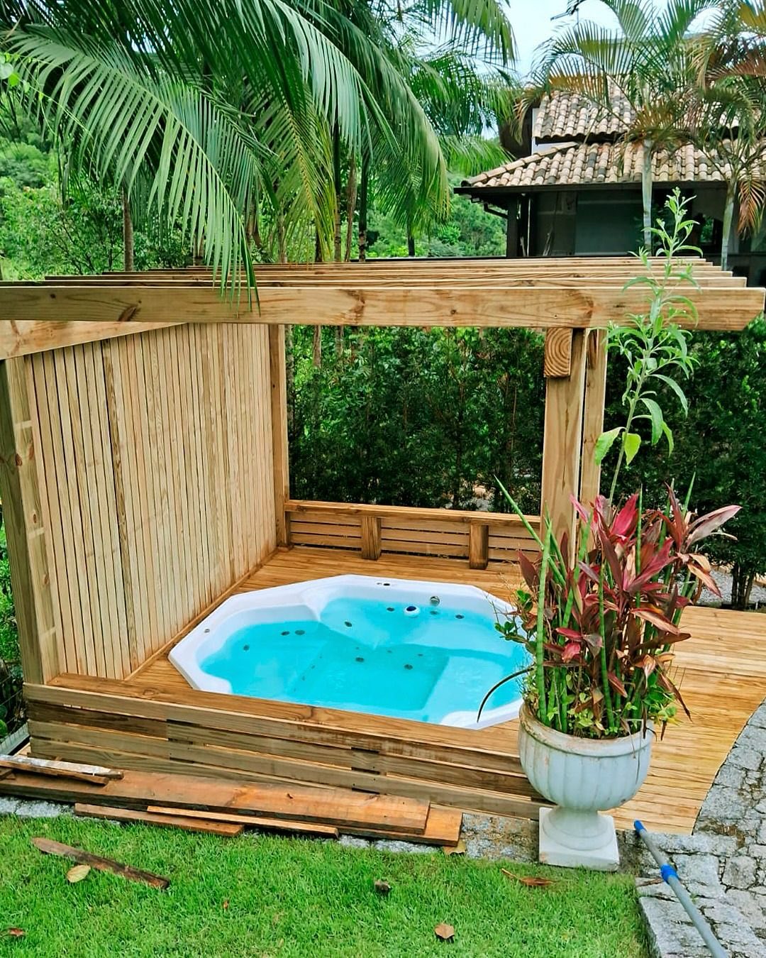 Design twist: Frame your Jacuzzi with low planter boxes or wrap-around bench seating. It anchors the tub visually and provides storage or seating, making the setup feel more polished and functional.