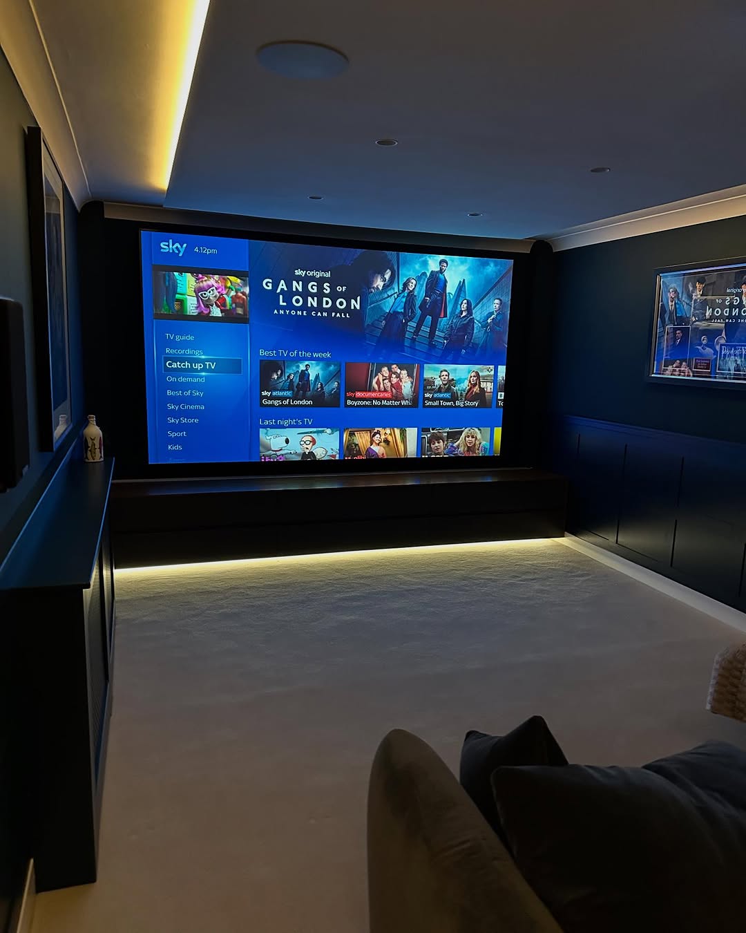 What worked? Mounting it on the short wall so the room has depth, and setting the center of the screen just above eye level when seated. It mimics the slight upward angle of a commercial theater, which feels natural when you lean back.